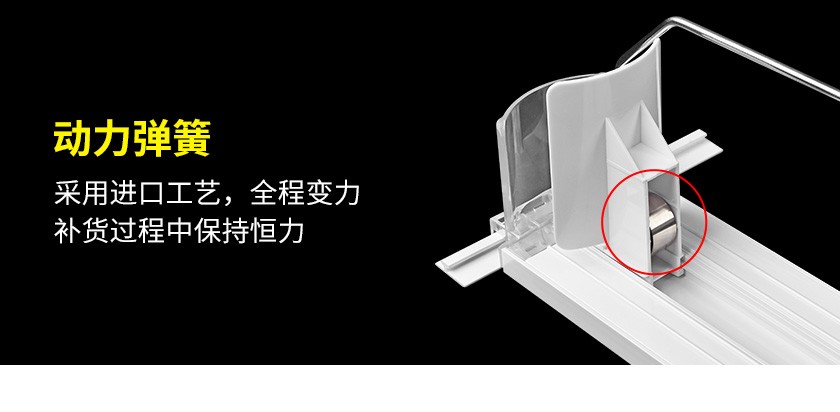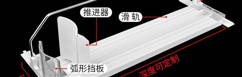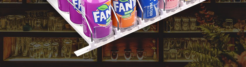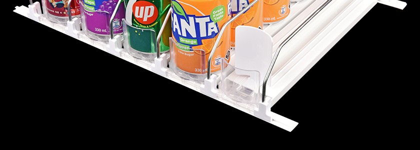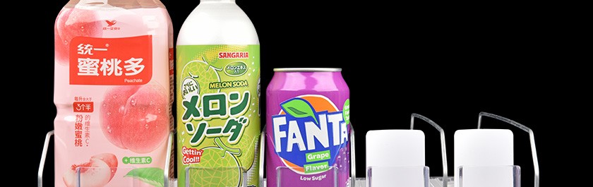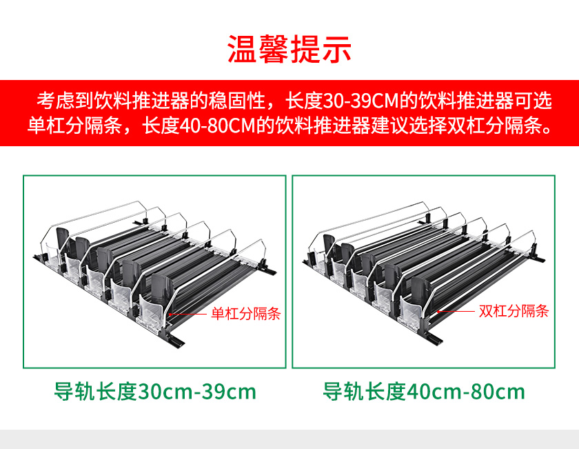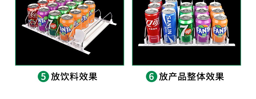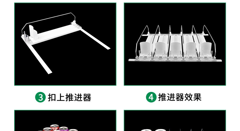 飲料推進器的定義: 飲料款推進器是導軌、推進器,鍍鋅分隔條組裝而成的自動飲料推進貨架。設計亮點: