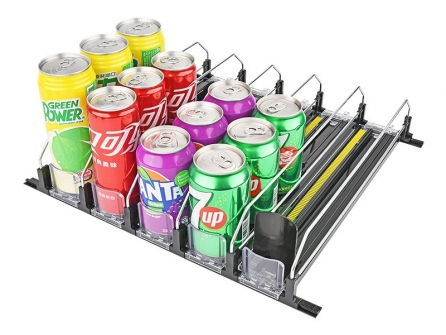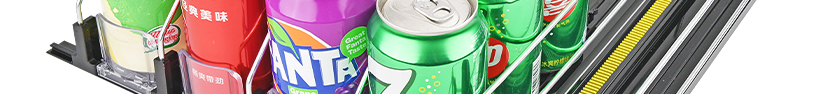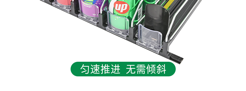 顧名思義就是常規(guī)飲料推進(jìn)器上面加裝阻尼減速裝置,并搭配齒輪,齒條而成的一種可以自動緩慢勻速推進(jìn)的貨架推進(jìn)器。