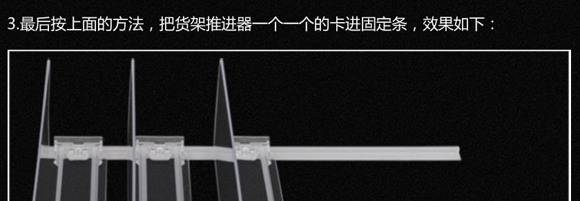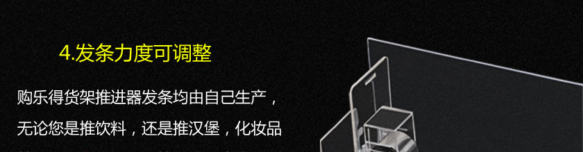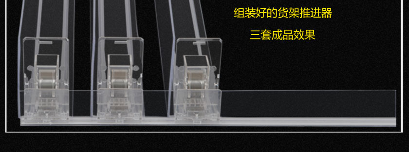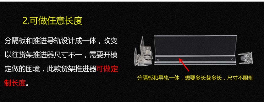 飲料款推進(jìn)器是在原有推進(jìn)器的基礎(chǔ)上改進(jìn)的一個(gè)款式,把推進(jìn)器導(dǎo)軌和擋板設(shè)計(jì)成一體,可按要求定做所需尺寸,且推進(jìn)器隔板更高,只要匹配合適力度的推進(jìn)動(dòng)力發(fā)條,可推大體積商品,無需開??勺龆ㄖ崎L度。