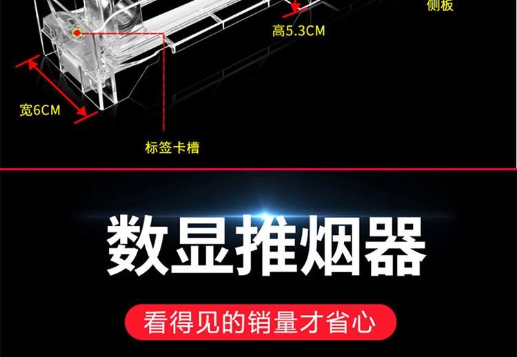 數(shù)顯推煙器是在單邊款推煙器的基礎(chǔ)上改變而成的,加裝數(shù)顯編織條,紐扣,實(shí)現(xiàn)香煙售賣實(shí)時(shí)顯示,純物理織帶數(shù)顯,無需用電,讓看得見的銷量更放心。 當(dāng)客人取走擺放在數(shù)顯推煙器上面的第一個(gè)商品后,后面的商品會(huì)自動(dòng)的往前推,始終讓商品展示在第一位,大大提升了商品的展示能力,不需要專門組織人工去整理貨物,節(jié)省人工和成本。