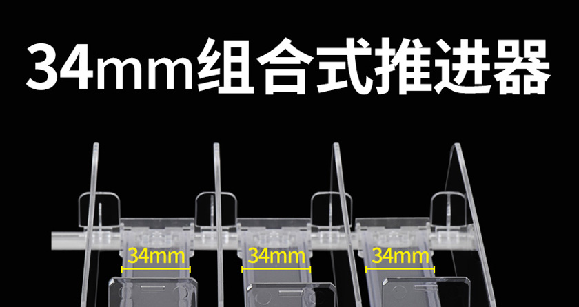 香煙推進器其實是34mm組合式推進器應用上的一種,是指推進器的導軌寬度為34mm,由前后固定條、推進器、分隔板組合而成,使用時需要前后固定條上的膠紙固定在層板上,因分隔板能調(diào)節(jié)寬度而廣泛應用。