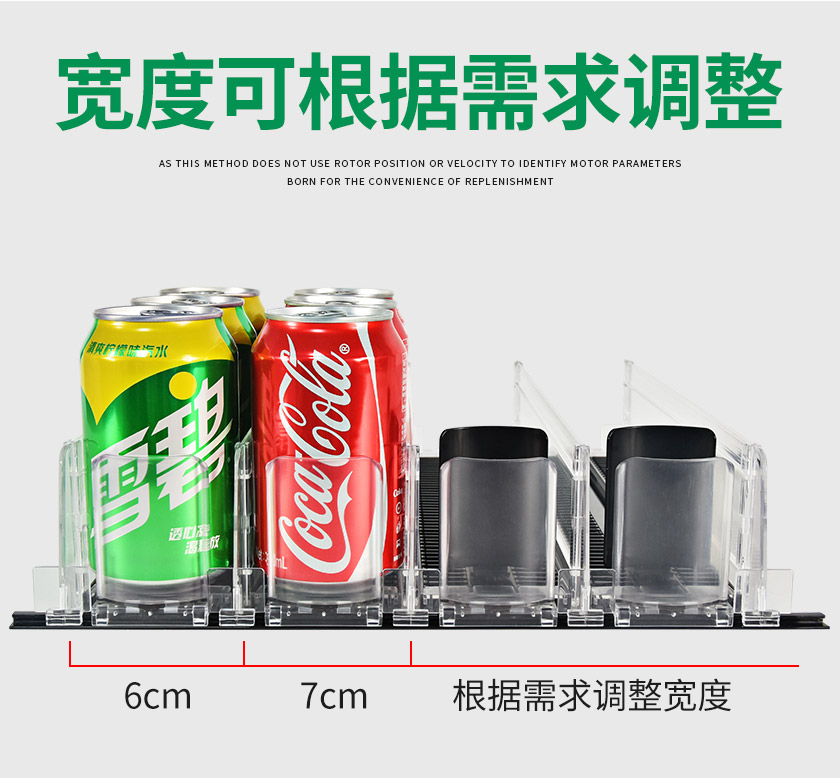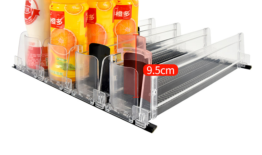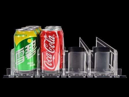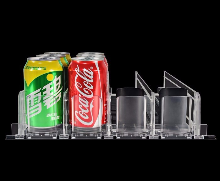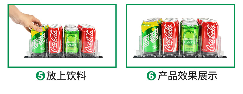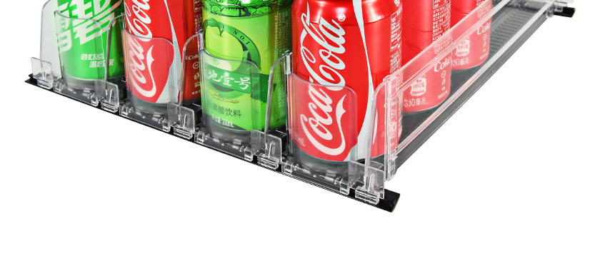 當(dāng)客人取走擺放在飲料推進(jìn)器上面的第一個(gè)商品后,后面的商品會(huì)自動(dòng)的往前推,始終讓商品展示在第一位,大大提升了商品的展示能力,不需要專門(mén)組織人工去整理貨物,節(jié)省人工和成本。