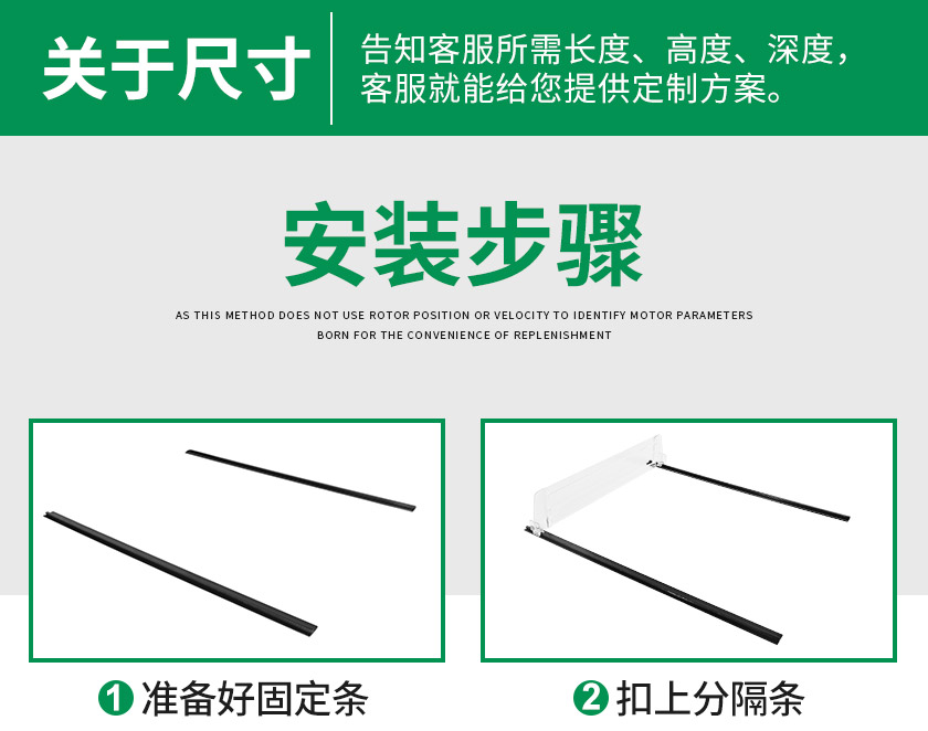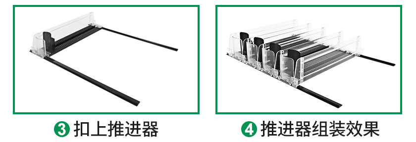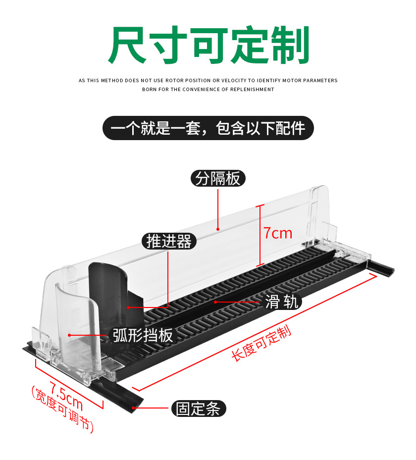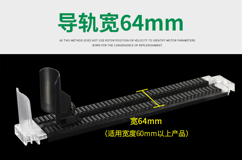 64mm寬組合款飲料推進(jìn)器是只推進(jìn)器導(dǎo)軌寬度為64mm,其他部分由分隔板、固定條,推進(jìn)器組裝一起的飲料推進(jìn)器。其分隔板“組合式”結(jié)構(gòu),解決了不同貨柜尺寸的延伸應(yīng)用,無(wú)需要重復(fù)開(kāi)??勺龆ㄖ崎L(zhǎng)度。