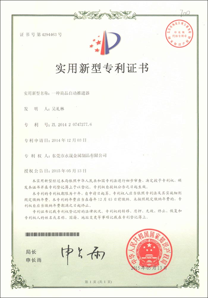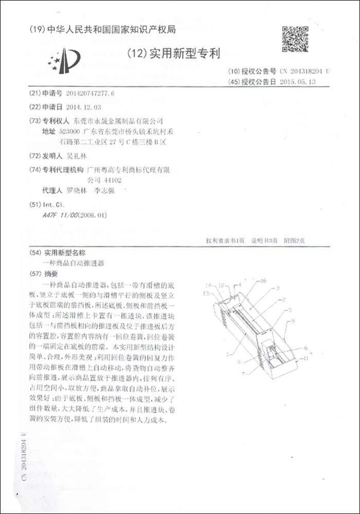 一種商品推進(jìn)器專利證書